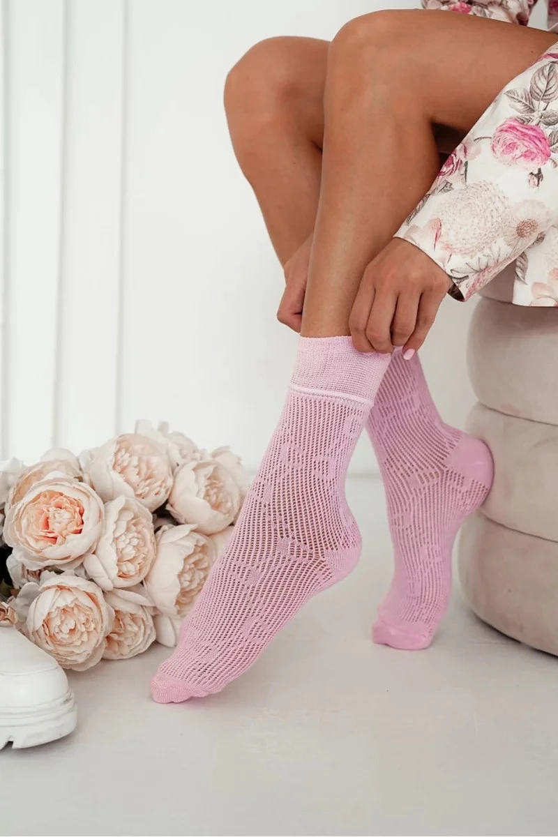 Růžové dámské azurové ponožky CC jsou měkké, pohodlné a ideální pro každodenní nošení. Lehký a prodyšný vzor dodává ponožkám elegantní vzhled a příjemný pocit na noze. Jemná růžová barva a nenápadný motiv písmena CC podtrhují styl a ženskost.