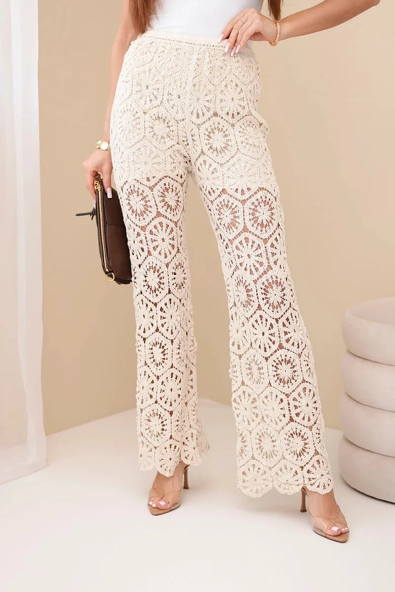 Stylové dámské kalhoty s ažurovým pletením jsou výjimečnou volbou pro ženy, které si cení originálního designu a pohodlí. Model vyniká efektním dekorativním vzorem, který dodává celku lehkost a módní nádech. Průhledná struktura materiálu zajišťuje, že kalhoty skvěle zapadnou do letních outfitů, zejména ve stylu boho a casual.