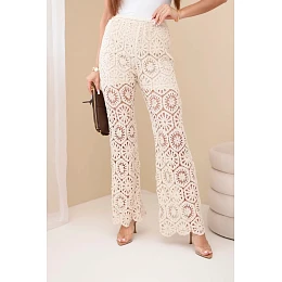 Dámské bavlněné ažurové kalhoty se širokými nohavicemi a elastickým pasem béžové