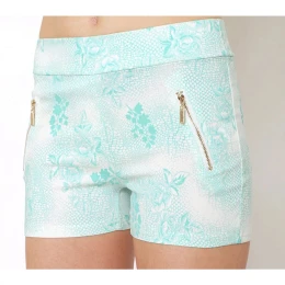 Dámské kalhoty šortky BLACK&FISH v přední partii ozdobené zlatými zipy na falešných kapsách. Materiál je velmi elasticky a šortky jsou proto sexy přiléhavé. Šortky jsou také ozdobené květinovým potiskem.