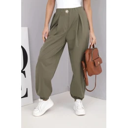 Dámské bavlněné kalhoty s vysokým pasem a ozdobným knoflíkem khaki