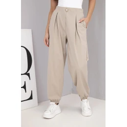 Tyto elegantní dámské kalhoty s vysokým pasem jsou nabídkou pro ženy, které si cení spojení pohodlí a stylu. Volný střih s mírně zúženými nohavicemi zakončenými stahovacími manžetami dává kalhotám krásný tvar na postavě a hodí se k mnoha stylizacím – jak každodenním, tak i elegantnějším. Ozdobný knoflík vpředu jim dodává šarm a klasické zakončení. Skvěle se kombinují s blůzkami, topy nebo sako, čímž vytvářejí módní a ženský vzhled.