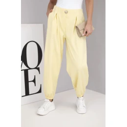 Dámské bavlněné kalhoty s vysokým pasem a ozdobným knoflíkem žluté