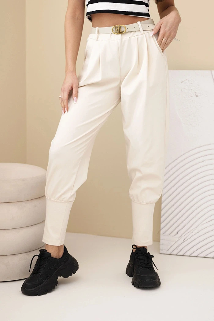 Dámské bavlněné kalhoty s vysokým pasem a páskem béžová