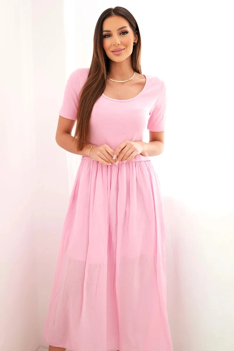 Dámské bavlněné midi šaty s krátkým rukávem a rozšířeným spodkem světle růžová