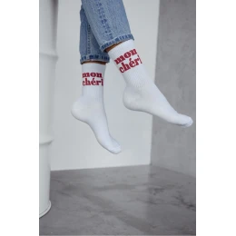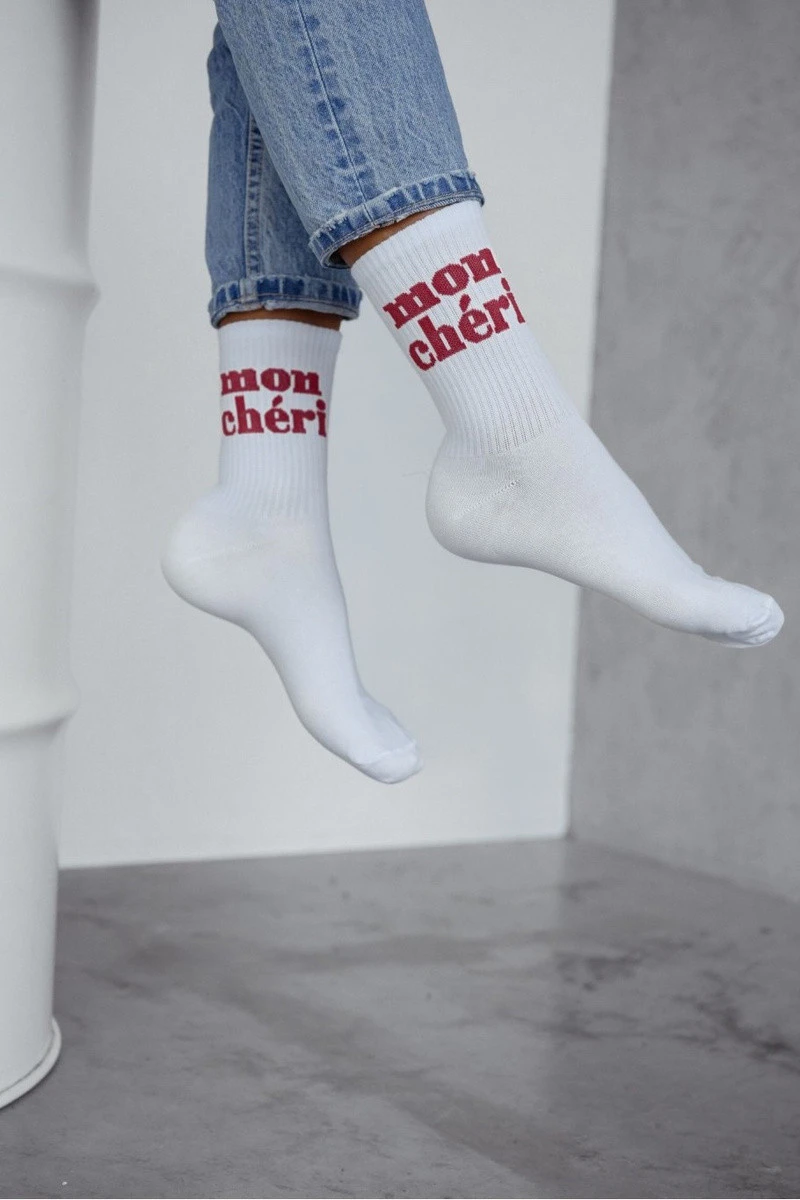Dámské bavlněné ponožky Mon Chéri s bordó nápisem – bílé