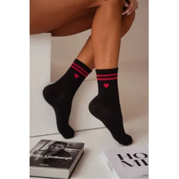Stylové dámské bavlněné ponožky v černé barvě zdobené drobným srdíčkem a jemnými proužky. Jsou měkké, prodyšné a ideální pro celodenní pohodlné nošení.