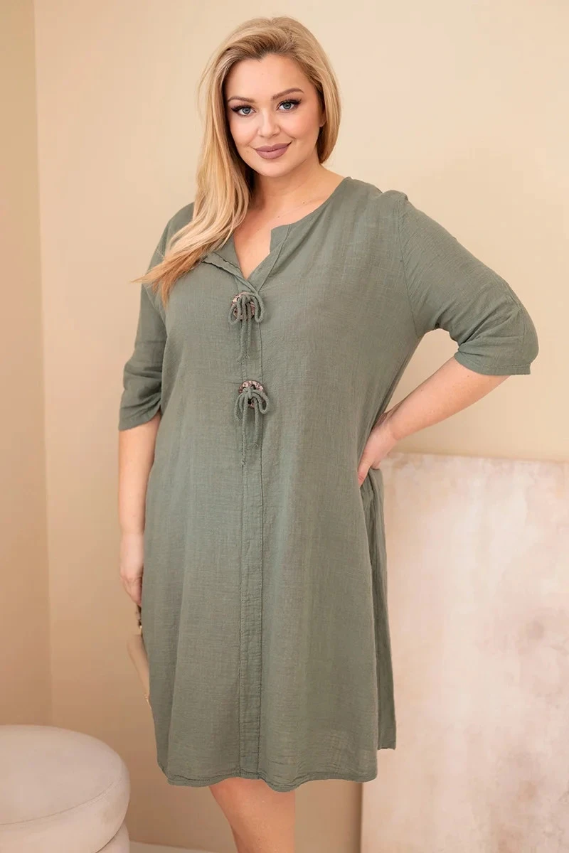 Volný střih jemně padne na postavu, nepřiléhá těsně a zaručuje plnou volnost pohybu. Model má rukáv do lokte a výstřih do V s ozdobným zavázáním a dekorativními prvky, které celku dodávají originální charakter. Jsou to oversize dámské šaty, které skvěle zakryjí nedokonalosti a zvýrazní přednosti postavy.