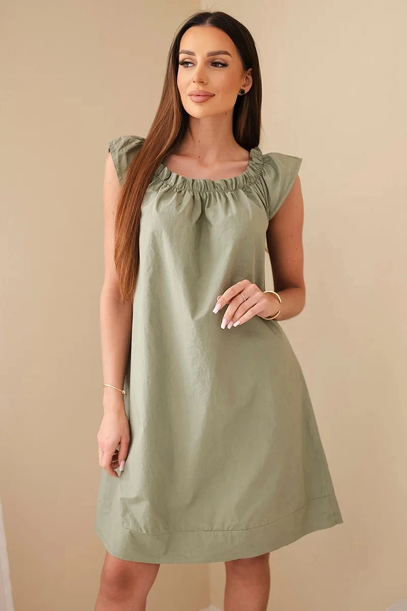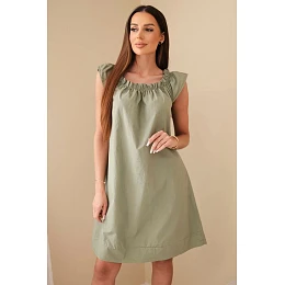 Dámské bavlněné šaty s nařaseným výstřihem a volánem khaki
