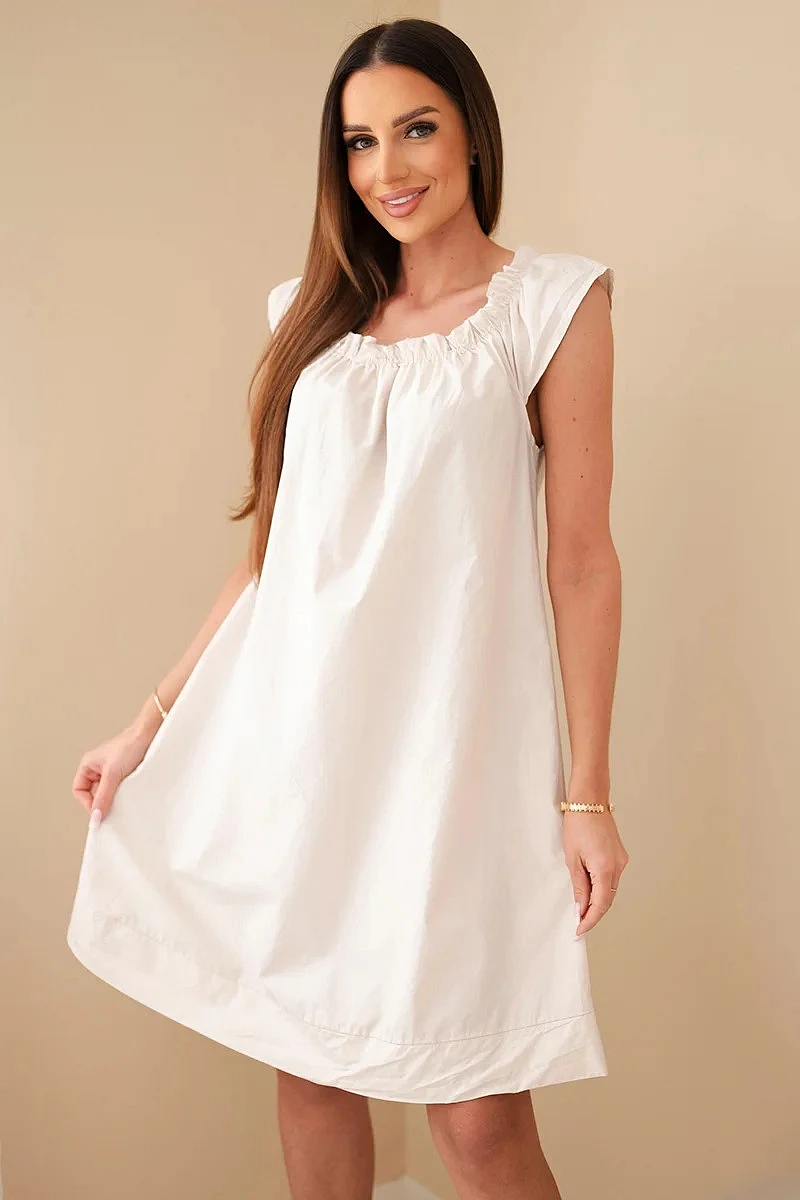 Dámské bavlněné šaty s nařaseným výstřihem a volánkem béžová