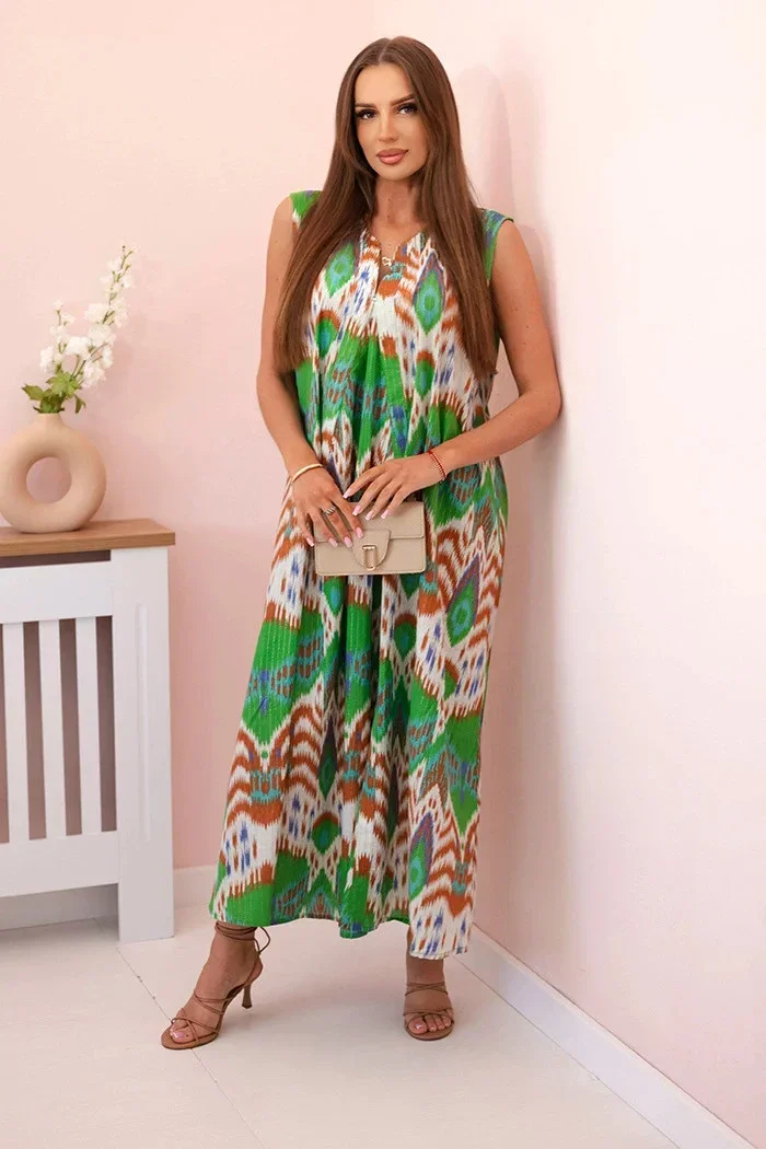 Tato dámské šaty bez rukávů jsou ideální volbou pro teplejší dny. Jejich efektní, etnický vzor upoutá pozornost a rozšířený střih dodá postavě lehkost a volnost. Vyrobeny ze 100% bavlny, zajišťují maximální pohodlí, přirozenou prodyšnost a příjemný dotek. Výstřih do V dodává ženský šarm a volný střih je ideální jak na dovolenou, procházku po městě, tak i na letní setkání. Je to univerzální model, který by neměl chybět ve vašem šatníku. Velikost je univerzální a bude vhodná pro ženy velikostí S, M nebo L.