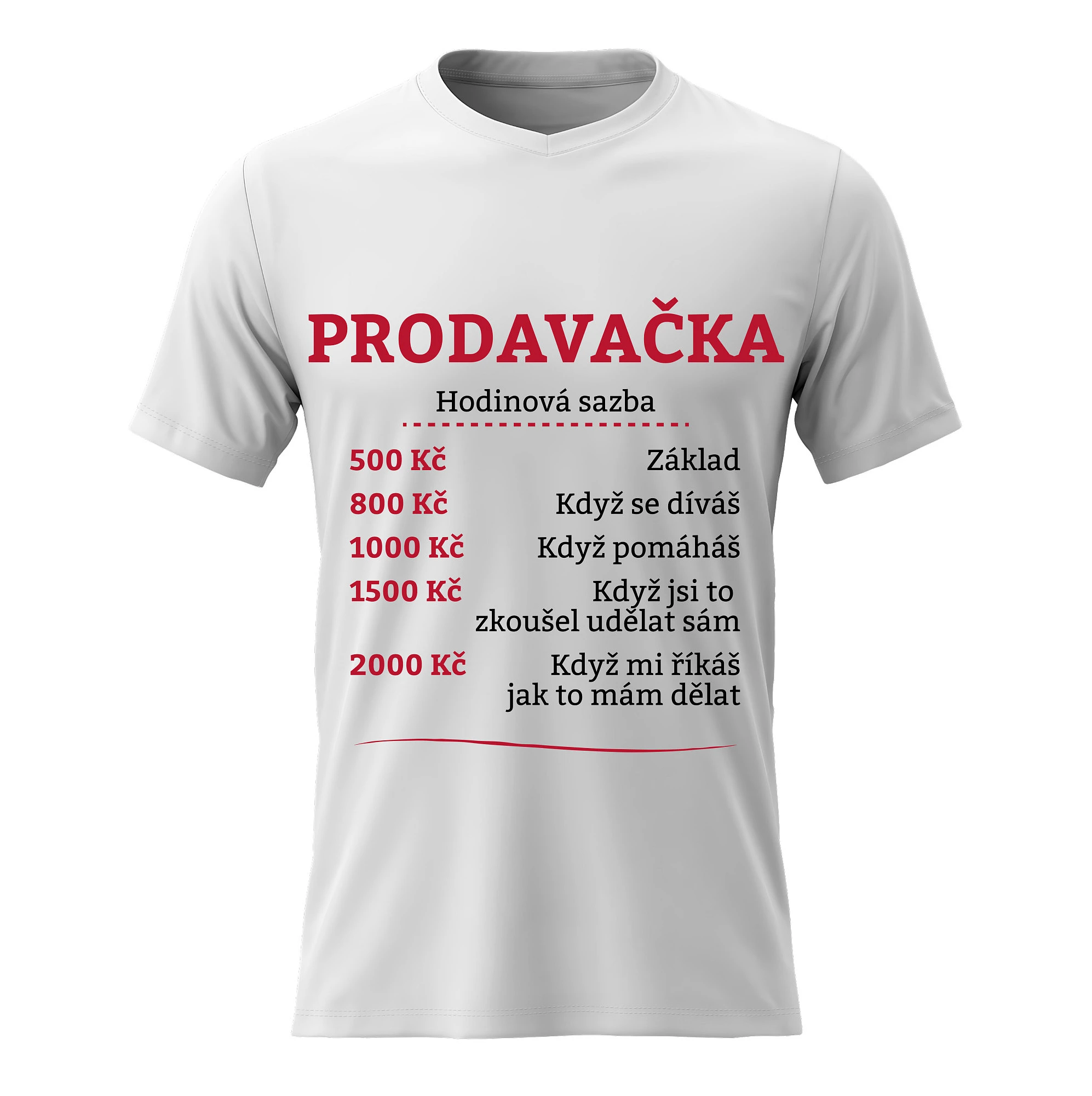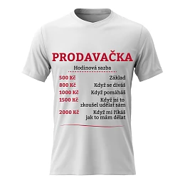 Vtipné tričko s potiskem HODINOVÁ SAZBA PRODAVAČKA – styl s nadhledem
