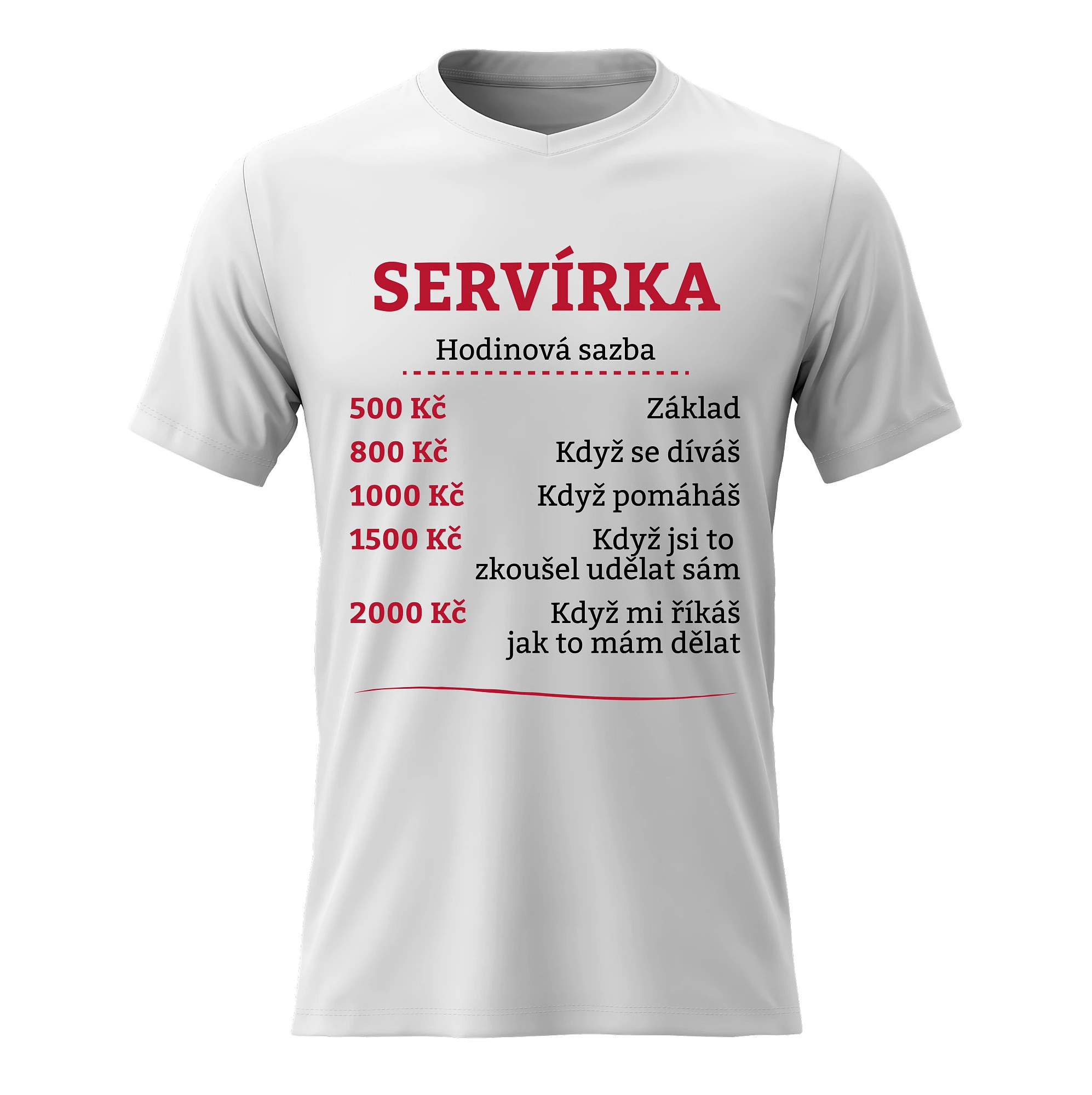 Vtipné tričko s potiskem HODINOVÁ SAZBA SERVÍRKA – styl s nadhledem