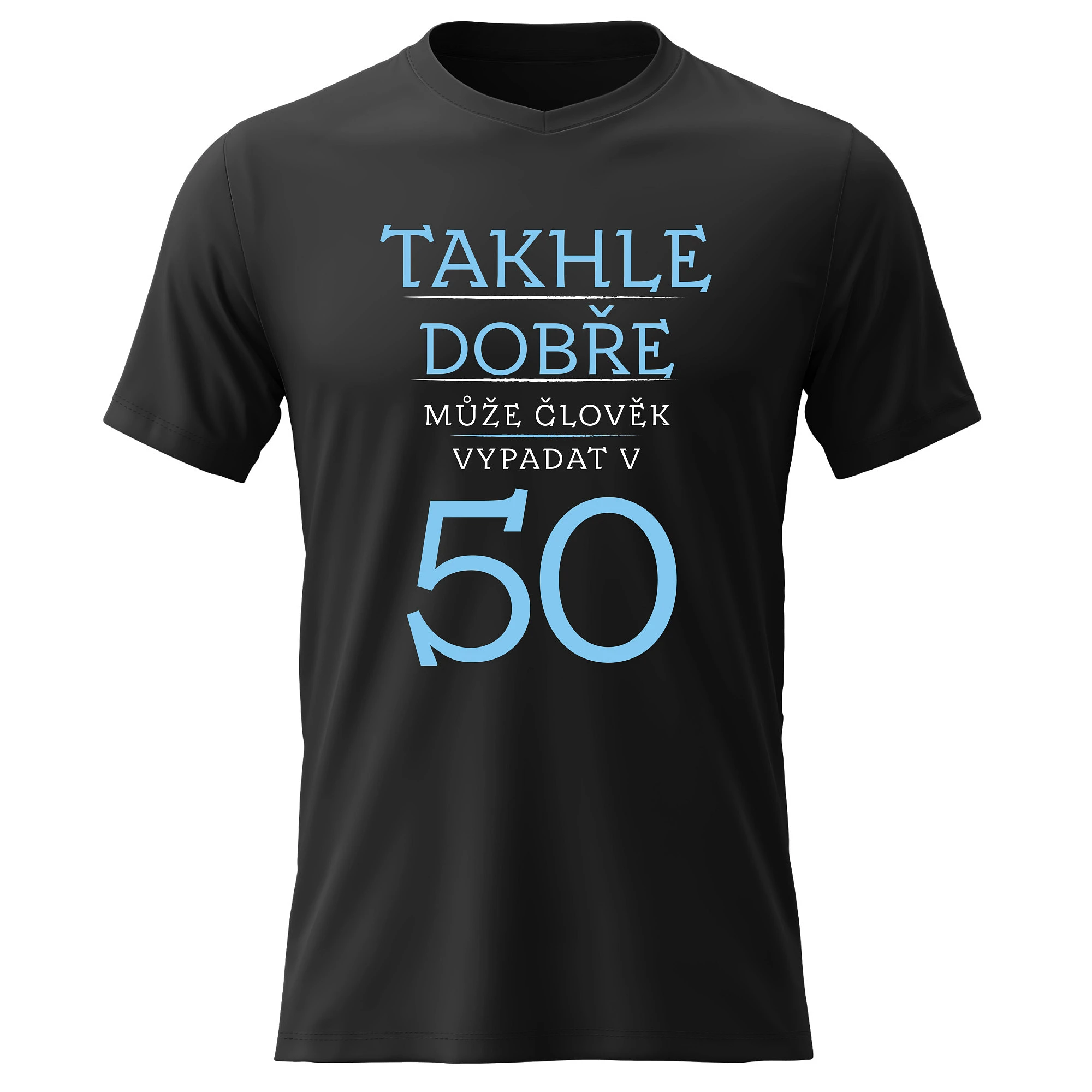 Vtipné tričko s potiskem TAKHLE DOBŘE MŮŽE ČLOVĚK VYPADAT V 50 (MODRÁ) – styl s nadhledem
