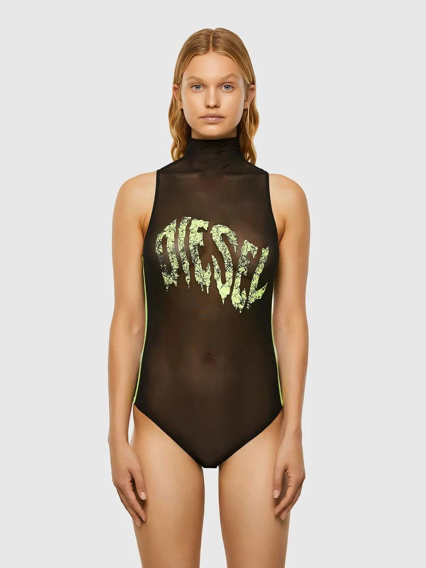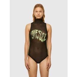 Body bez rukávů vyrobené z měkké strečové síťoviny, s rolákovým límcem. Přední strana je potištěna kapajícím logem Diesel v odstínu jasně zeleném.