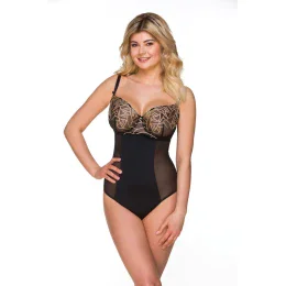 Košíčky jsou ozdobené materiálem s originálním kontrastním vzorem a jsou vhodné pro větší poprsí. Přední díl body je vyrobený z hladkého černého mikrovlákna. Boky tvoří transparentní síťovina. Ramínka je možné nastavit, ale nelze je odepnout. Šířka a typ zapínání jsou přizpůsobené velikosti a rozměru podprsenky.