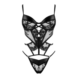 Dámské erotické body Amalia teddy BEAUTY NIGHT FASHION - černá barva - z průhledné síťoviny zdobenou puntíky - sexy výstřihy kolem poprsí - zdobené mašličkami - zapínání v rozkroku