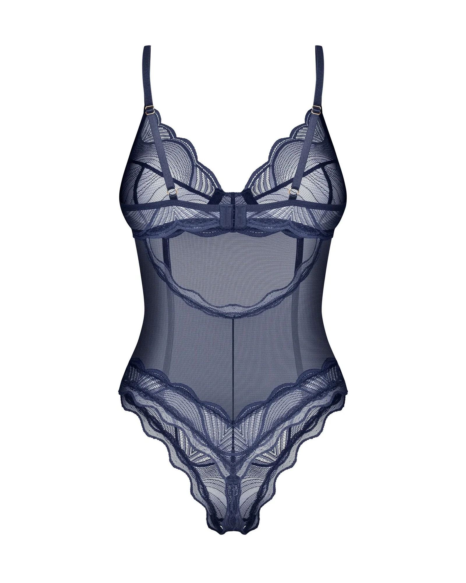 Odhalte své nejhlubší touhy s nočním modrým body bez rozkroku. Tento smyslný kousek v tmavě modré barvě je vyroben z kombinace průsvitné látky a jemné krajky zdobené složitými výšivkami. Design zdůrazňuje vaše křivky díky odvážnému otevřenému rozkroku, odhaleným zádům a vycpaným košíčkům s kosticemi, které poskytují oporu i přitažlivost.