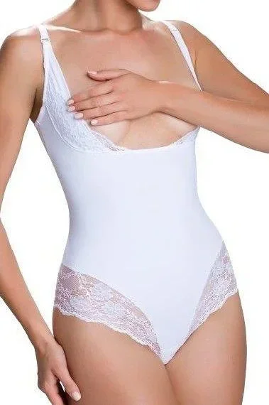 Elegantní tvarující prádlo - body pod prsa - v tomto provedení zakončené stylovou krajkou na okrajích. Návrh, který vám umožní rychle a účinně vyhladit a zeštíhlit linii těla v oblasti břicha a boků. Díky použité krajce zde prádlo vypadá velmi žensky, přestože plní svou funkci. Zadní část se dokonale přizpůsobí tělu, v rozkroku se zapíná na 3 háčky. Složení: 80 % polyamid, 17 % elastan, 3 % bavlna.