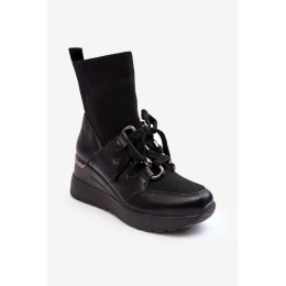 Boty dámské ve sportovním stylu vyrobené z kombinace ekologické kůže a textilního materiálu. Osazené na klínku. Šos s tvarovanou ponožkou. Model s vloženým šněrováním. Špička zaoblená. Patka zesílená. Měkká, ekologická kožená vložka zajistí pohodlí při používání. Při výběru velikosti se řiďte tabulkou velikostí.