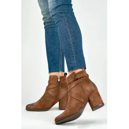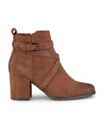 Boty z ekologické semišové kůže. Na vnitřní straně se zapínají na zip. Nasazené na středně vysokém sloupku. Ozdobné překřížené pásky s kovovou sponou kolem kotníku. Z vnitřní strany lehce zateplené. Pohodlné, klasické a velmi elegantní boty doplní mnoho podzimních stylizací.