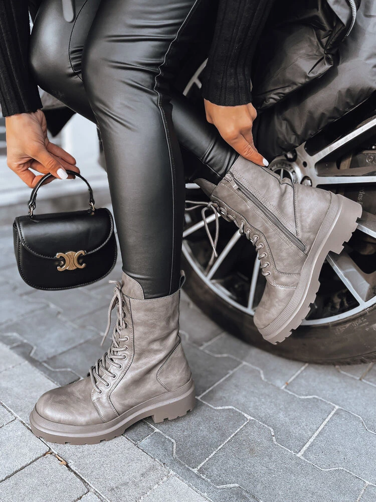 Šněrovací kozačky z kvalitní imitace kůže jsou ideální volbou pro tuto sezónu! Jsou umístěny na silné podrážce. Model není zateplený. Ideální pro podzimní a zimní styling.