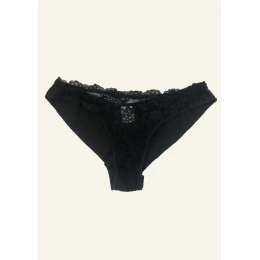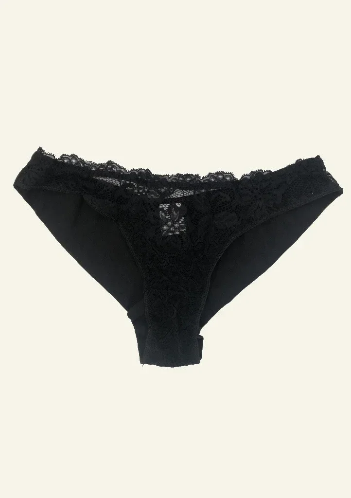 Dámské kalhotky brazilkového střihu Lovegirl od značky EMY. Brazilky jsou kombinací hladké černé látky a krásně dekorované krajky v přední části. Zadní část je prostřižena, aby dokonale padla na zadeček a je bezešvá. Uvnitř je vsazen bavlněný klínek pro pohodlné nošení.