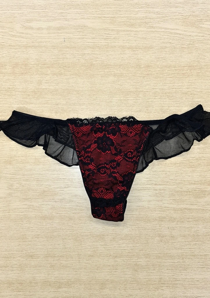 Elegantní krajkové kalhotky brazilkového střihu od značky Lovelygirl. Kalhotky mají velmi pružný a na dotyk příjemný tyl kolem boků, který dále pokračuje přes celou zadní část brazilek. Zakončení tylu tvoří hezké nařasení ve tvaru kanýrků po celé části. Přední část je podšitá bavlnou v červené barvě a na ní je pružná černá krajka.