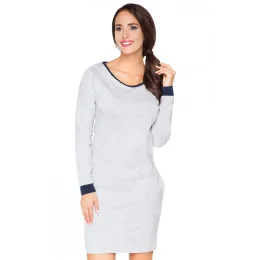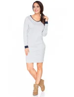 Šaty z pletené mikiny, v pase přestřižené. Výstřih a rukávy zakončené lemováním v kontrastní barvě. Spodní část šatů je rozšířená a ponechaná v surovém stavu.