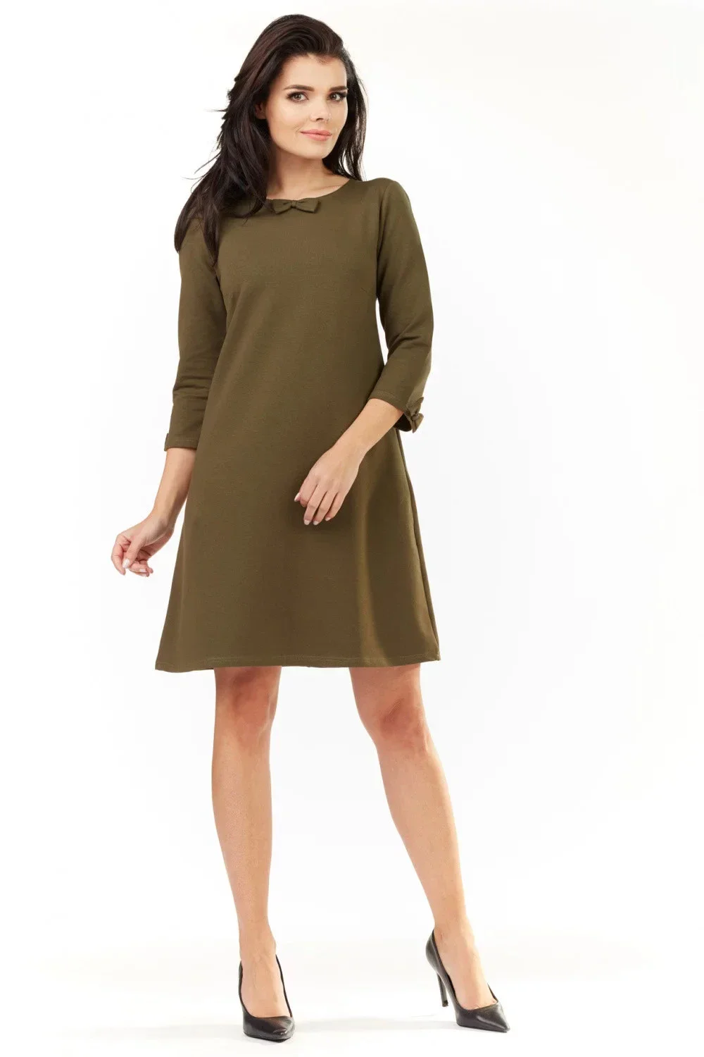 Skvělé šaty s 3/4 rukávy, mírně rozšířené. Zdobí je mašle na rukávech a ve výstřihu.