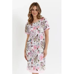 Romantyczna koszula nocna w kolorze delikatnego różu to kwintesencja kobiecego stylu i wygody. Wykonana z miękkiej, przewiewnej bawełny z dodatkiem elastanu, doskonale dopasowuje się do sylwetki, zapewniając pełną swobodę ruchów podczas snu. Krótkie rękawy oraz dół koszuli ozdobiono subtelnym kwiatowym motywem, który dodaje całości lekkości i świeżości. Luźny fason oraz miękka tkanina sprawiają, że koszula sprawdzi się zarówno w cieplejsze, jak i chłodniejsze noce. To idealny wybór dla kobiet ceniących wygodę połączoną z romantycznym wyglądem.