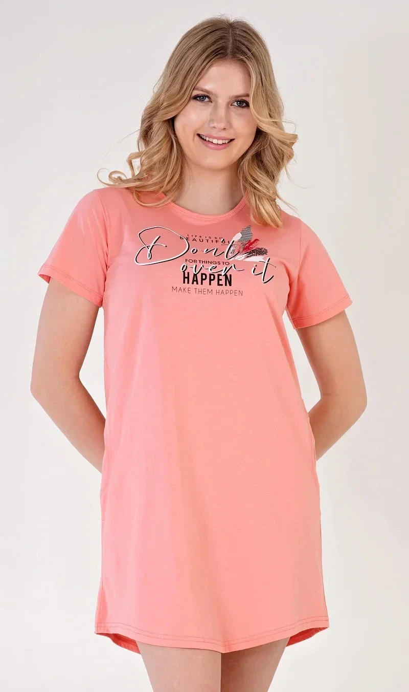 Dámské bavlněné domácí šaty s krátkým rukávem Lucie. Pohodlné jednobarevné domácí šaty s kulatým výstřihem jsou ozdobeny pestrým potiskem. Šaty mají praktické kapsy. Použitý bavlněný materiál je příjemný a poddajný na dotek. Domácí šaty jsou vhodné na spaní i na denní nošení.