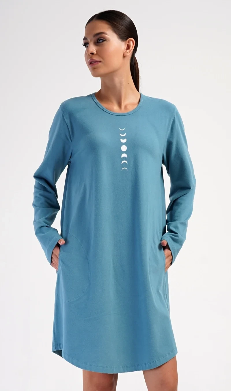 Dámské domácí šaty s dlouhým rukávem Alžběta. Jednobarevné domácí šaty s délkou po kolena, kulatým výstřihem a kapsami zdobí potisk v bílé barvě ve tvaru měsíčních fází. Použitý bavlněný materiál s příměsí elastenu je příjemný a poddajný na dotek.