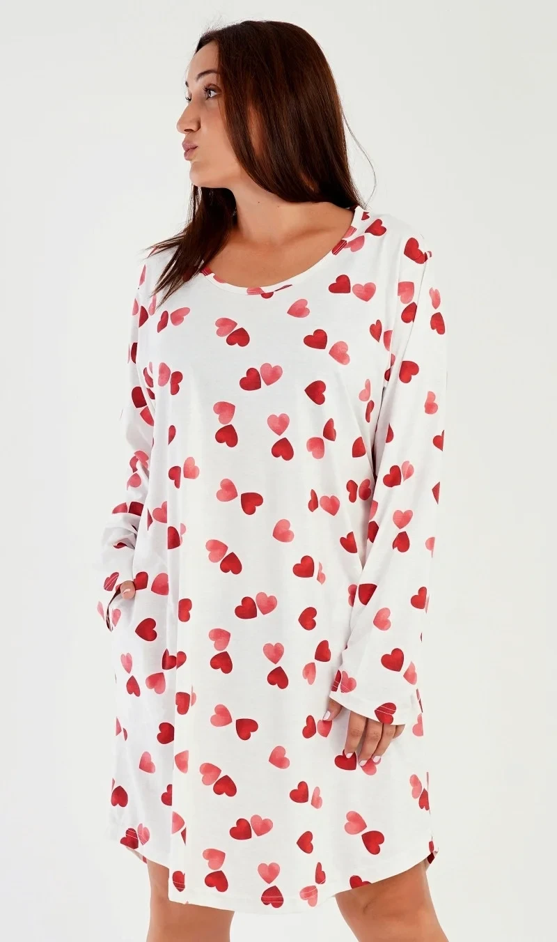 Dámské domácí šaty s dlouhým rukávem Srdce. Pohodlné domácí šaty s kulatým výstřihem zdobí potisk srdíček. Mají dlouhý rukáv, délku po kolena a praktické kapsy. Použitý materiál s obsahem bavlny 70% je příjemný a poddajný na dotek.