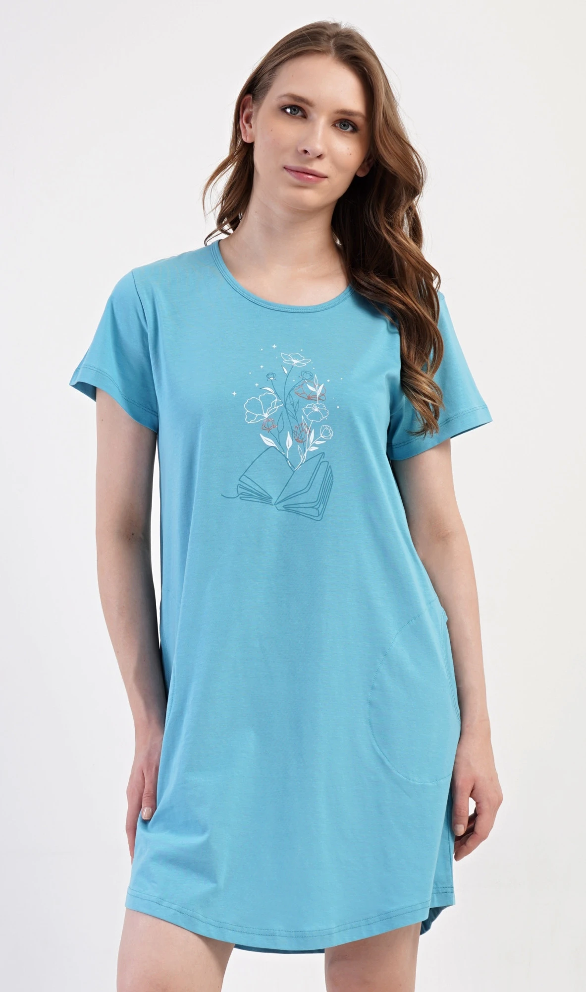 Dámské bavlněné domácí šaty s krátkým rukávem Book. Domácí jednobarevné šaty s kulatým výstřihem a kapsami zdobí na hrudi obrázek knihy a květů. Použitý bavlněný materiál je příjemný a poddajný na dotek. Šaty jsou pohodlné, vhodné na spaní i na denní nošení.