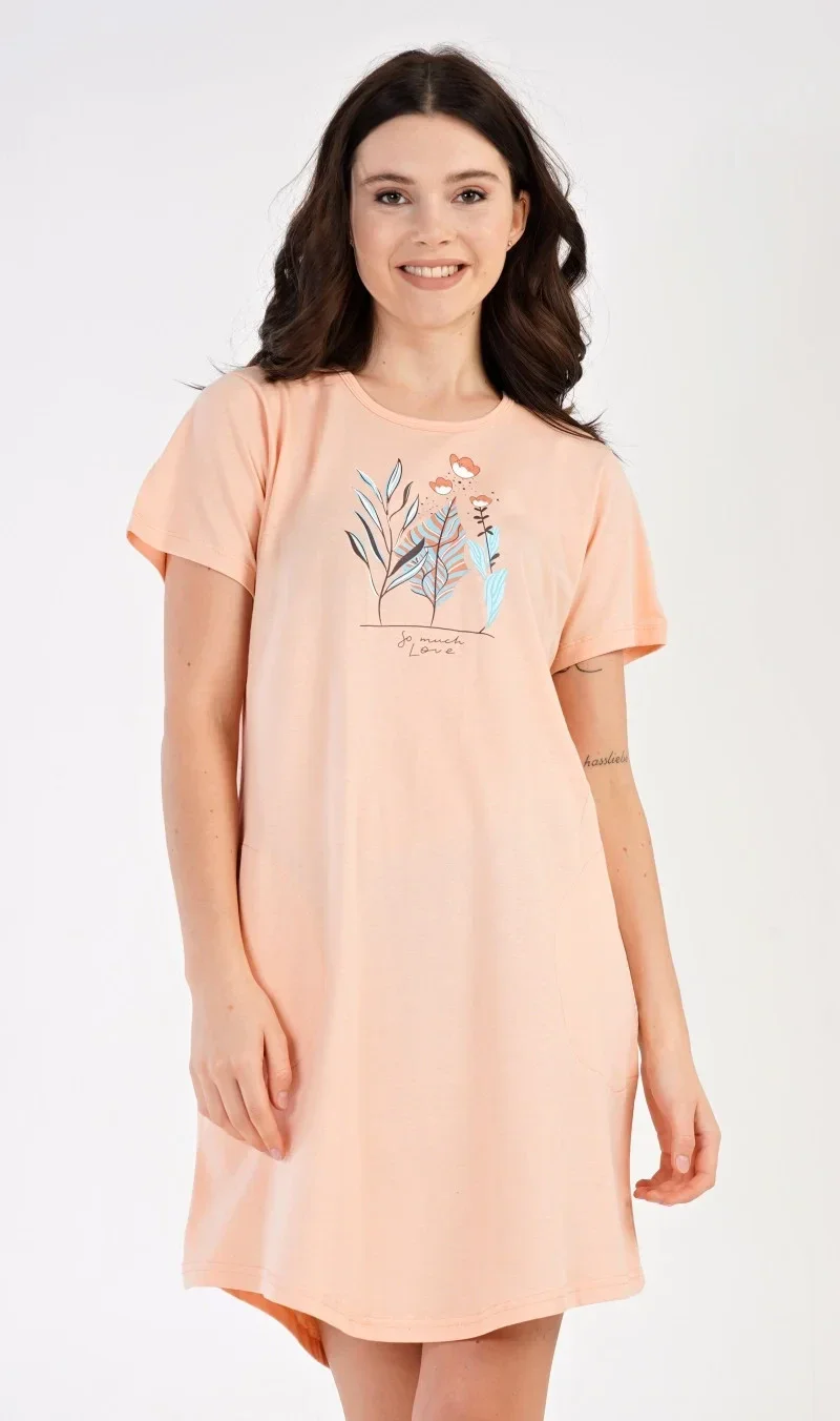 Dámské bavlněné domácí šaty s krátkým rukávem Garden. Dámské šaty s kulatým výstřihem jsou zdobeny potiském květin a decentním nápisem. Na bocích mají všité kapsy zdobené lemovkou. Použitý bavlněný materiál je příjemný a poddajný na dotek. Šaty jsou vhodné na spaní i na denní nošení.