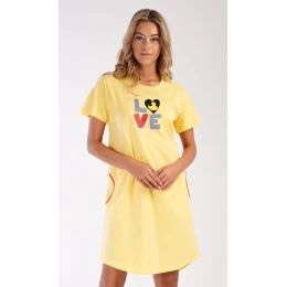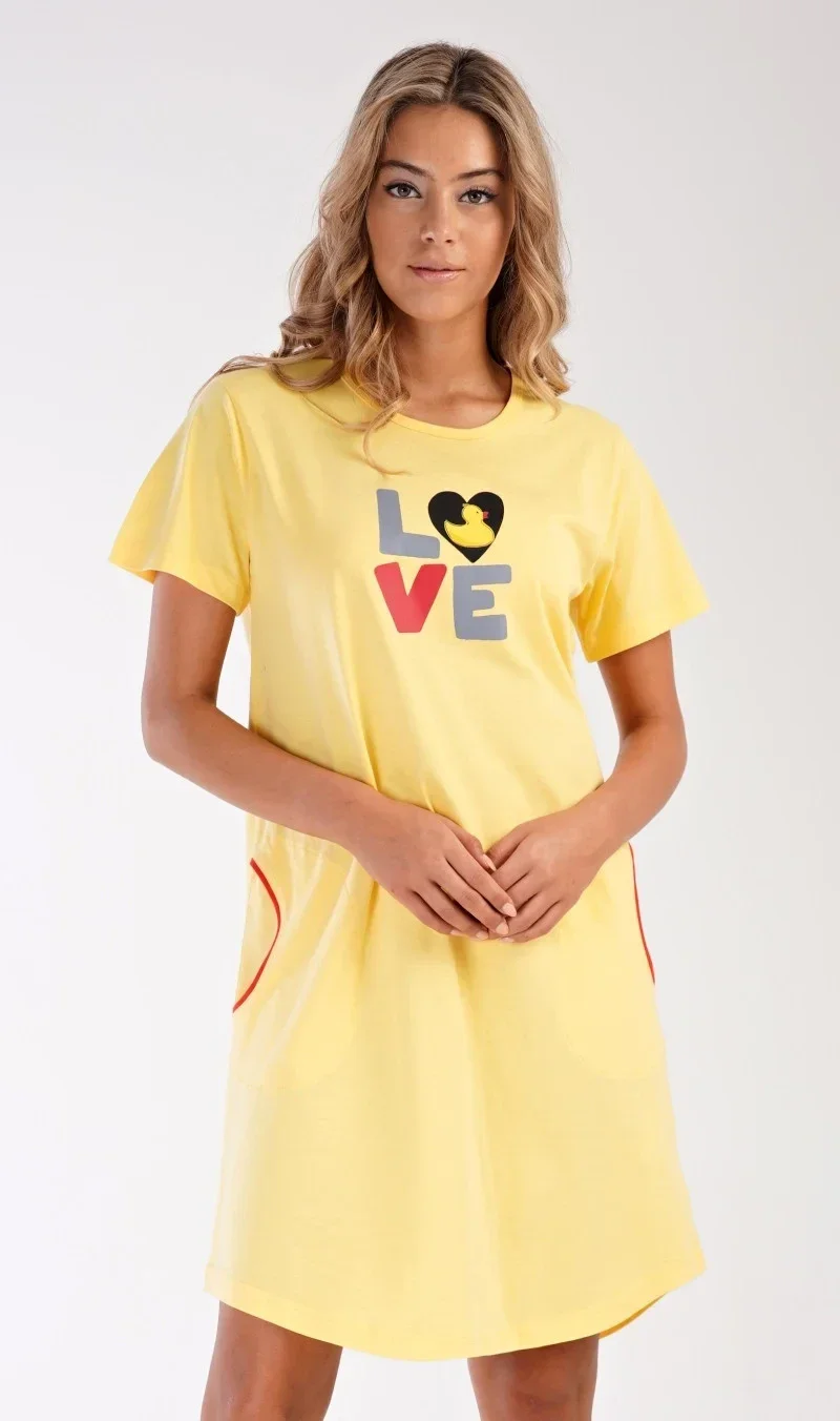 Dámské bavlněné domácí šaty s krátkým rukávem Kačenka. Pohodlné jednobarevné domácí šaty s kulatým výstřihem jsou ozdobeny nápisem LOVE a obrázkem kačenky. Šaty mají praktické kapsy, které jsou olemovány kontrastní lemovkou. Použitý bavlněný materiál je příjemný a poddajný na dotek. Šaty jsou vhodné na spaní i na denní nošení.