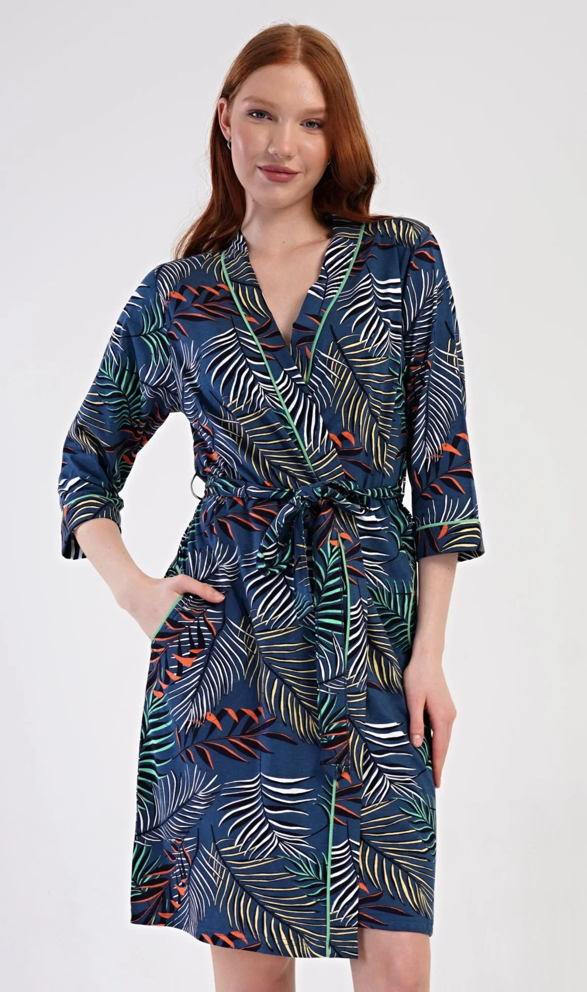 Dámský krátký bavlněný župan Barbara. Dámský župánek v délce pod kolena je potišten pestrobarevnými listy a větvičkami. Župan má pásek ke stažení a praktické kapsy. Použitý bavlněný materiál je příjemný a poddajný na dotek, saje a oceníte ho i po koupeli.