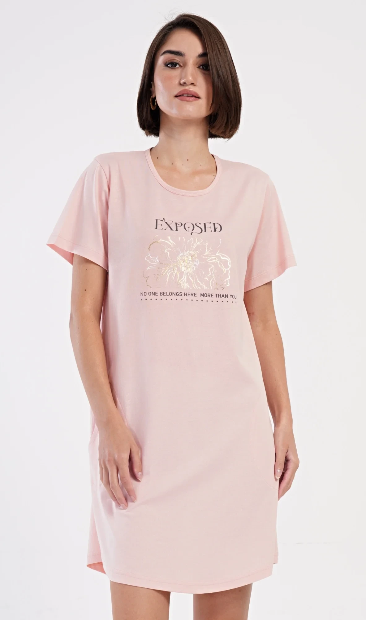 Dámské bavlněné domácí šaty s krátkým rukávem Michaela. Domácí jednobarevné šaty s kulatým výstřihem a kapsami zdobí na hrudi obrázek zlatého květu a nápys 'Exposed'. Použitý bavlněný materiál je příjemný a poddajný na dotek. Šaty jsou pohodlné, vhodné na spaní i na denní nošení.