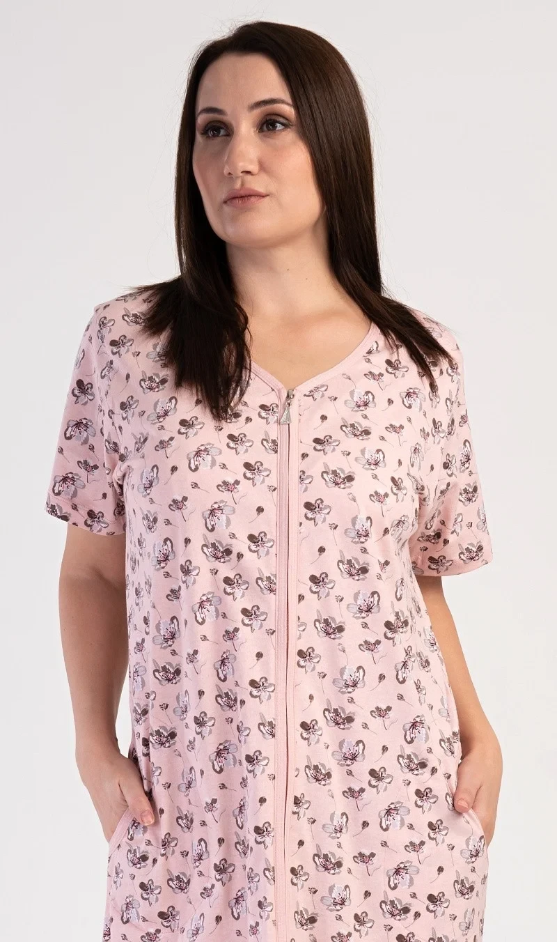 Dámské bavlněné domácí šaty s krátkým rukávem Olivia. Pohodlné rozepínací šaty v příjemné délce pod kolena využijete téměř při všech volnočasových aktivitách. Mají praktické kapsy a zapínání na zip. Šaty jsou decentně potištěny květy. Použitý bavlněný materiál je příjemný a poddajný na dotek.