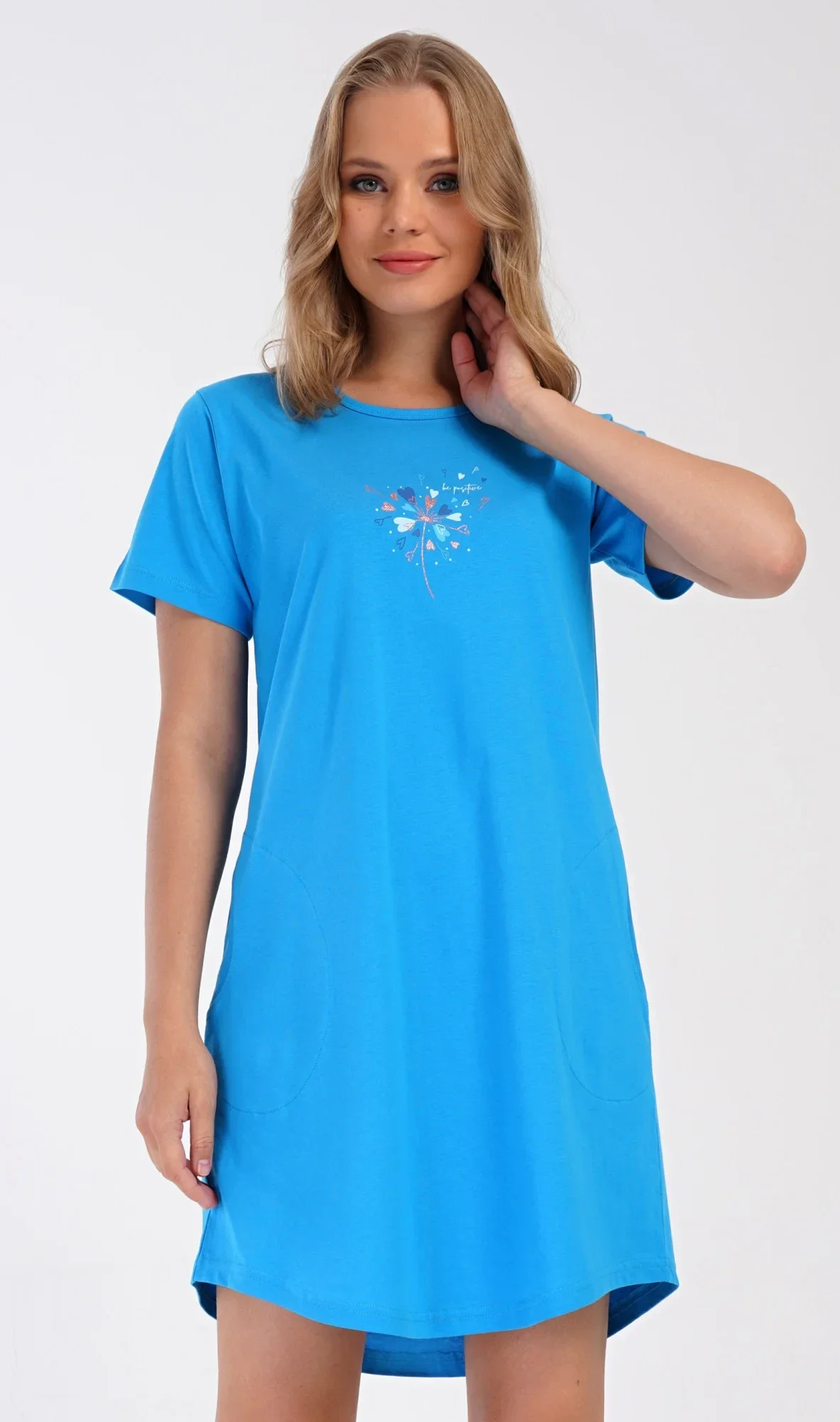 Dámské bavlněné domácí šaty s krátkým rukávem Pampeliška. Domácí jednobarevné šaty s kulatým výstřihem a kapsami zdobí na hrudi obrázek rozfoukané pampelišky. Použitý bavlněný materiál je příjemný a poddajný na dotek. Šaty jsou pohodlné, využijete je téměř při všech volnočasových aktivitách. Jsou vhodné na spaní i na denní nošení.
