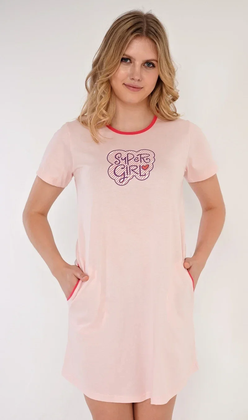 Dámské bavlněné domácí šaty s krátkým rukávem Super girl. Pohodlné jednobarevné domácí šaty s kulatým výstřihem jsou ozdobeny nápisem SUPER GIRL. Šaty mají praktické kapsy, které jsou olemovány kontrastní lemovkou. Ta je použita i u výstřihu. Použitý bavlněný materiál je příjemný a poddajný na dotek. Šaty jsou vhodné na spaní i na denní nošení.