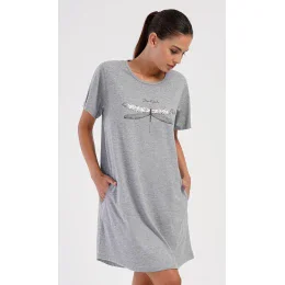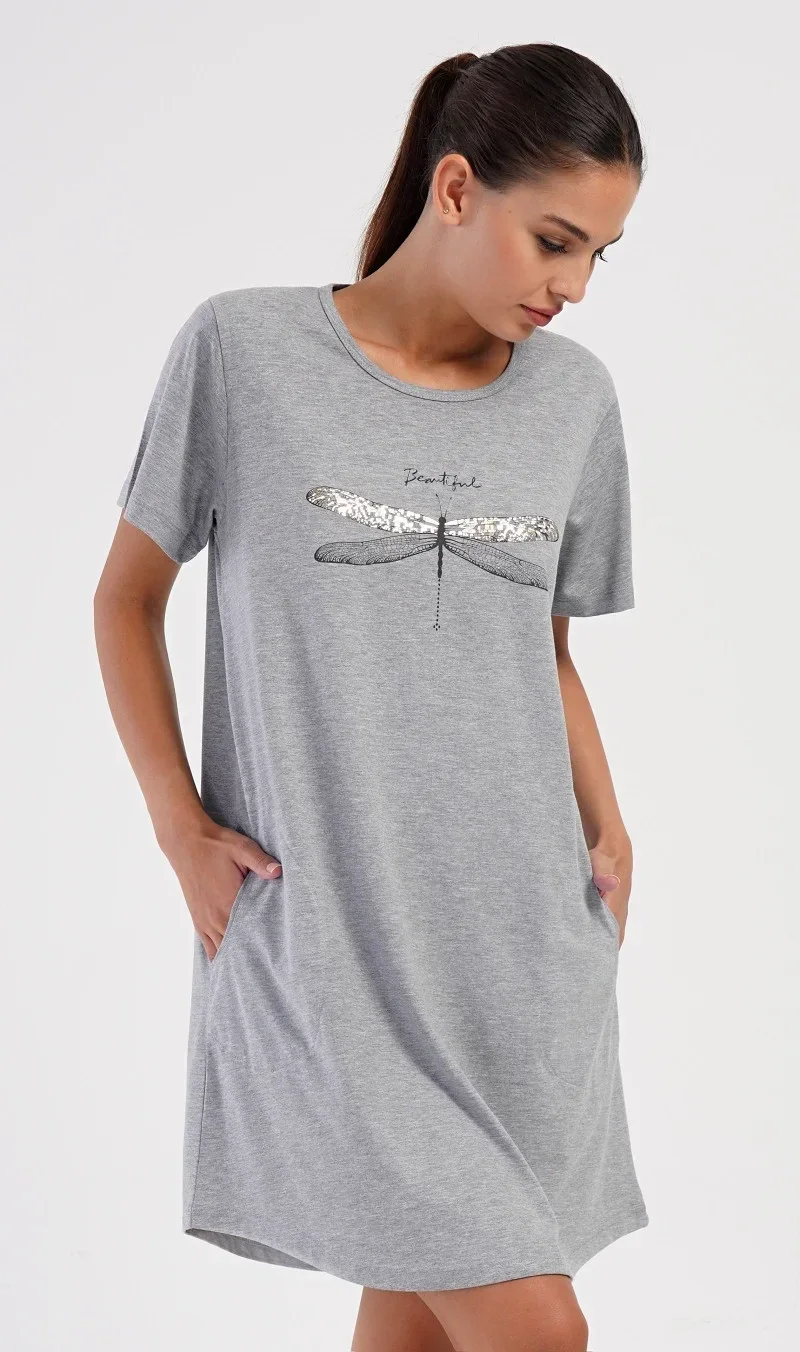 Dámské bavlněné domácí šaty s krátkým rukávem Vážka. Domácí jednobarevné šaty s kulatým výstřihem a kapsami zdobí obrázek vážky a nápis 'Beautiful'. Použitý bavlněný materiál je příjemný a poddajný na dotek. Šaty jsou pohodlné, využijete je téměř při všech volnočasových aktivitách. Jsou vhodné na spaní i na denní nošení.