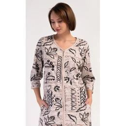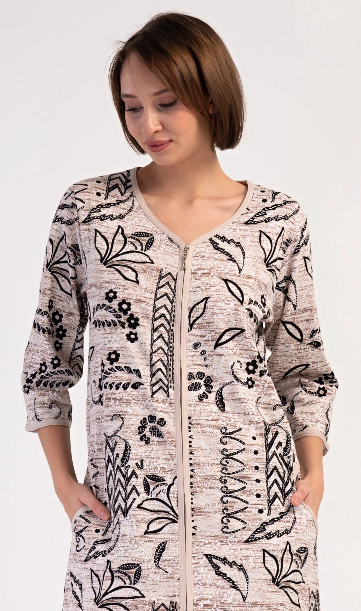 Dámské bavlněné domácí šaty s tříčtvrtečním rukávem Elena. Pohodlné rozepínací šaty v příjemné délce pod kolena využijete téměř při všech volnočasových aktivitách. Mají praktické kapsy a zapínání na zip. Šaty jsou potištěny listy a květy. Použitý bavlněný materiál je příjemný a poddajný na dotek.