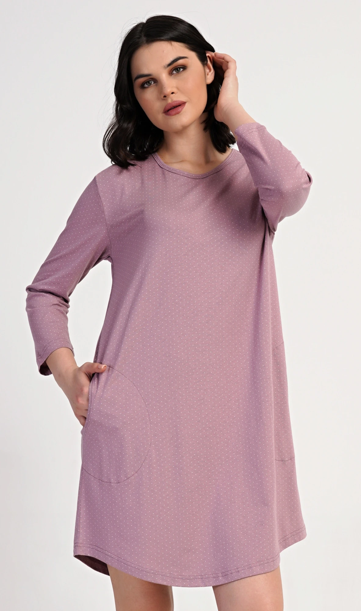 Dámské bavlněné domácí šaty s tříčtvrtečním rukávem Emily. Domácí bavlněné šaty s kulatým výstřihem jsou potištěny drobnými puntíky. Použitý bavlněný materiál je příjemný a poddajný na dotek.