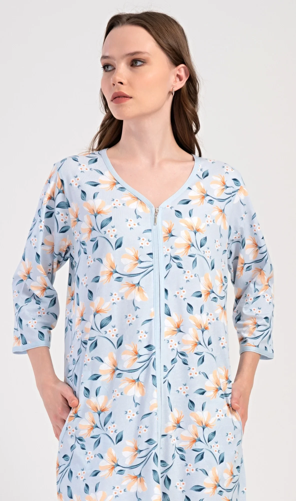 Dámské bavlněné domácí šaty s tříčtvrtečním rukávem Karolína. Pohodlné rozepínací šaty v příjemné délce pod kolena využijete téměř při všech volnočasových aktivitách. Mají praktické kapsy a zapínání na zip. Šaty jsou potištěny jemným květinovým vzorem. Použitý bavlněný materiál je příjemný a poddajný na dotek.