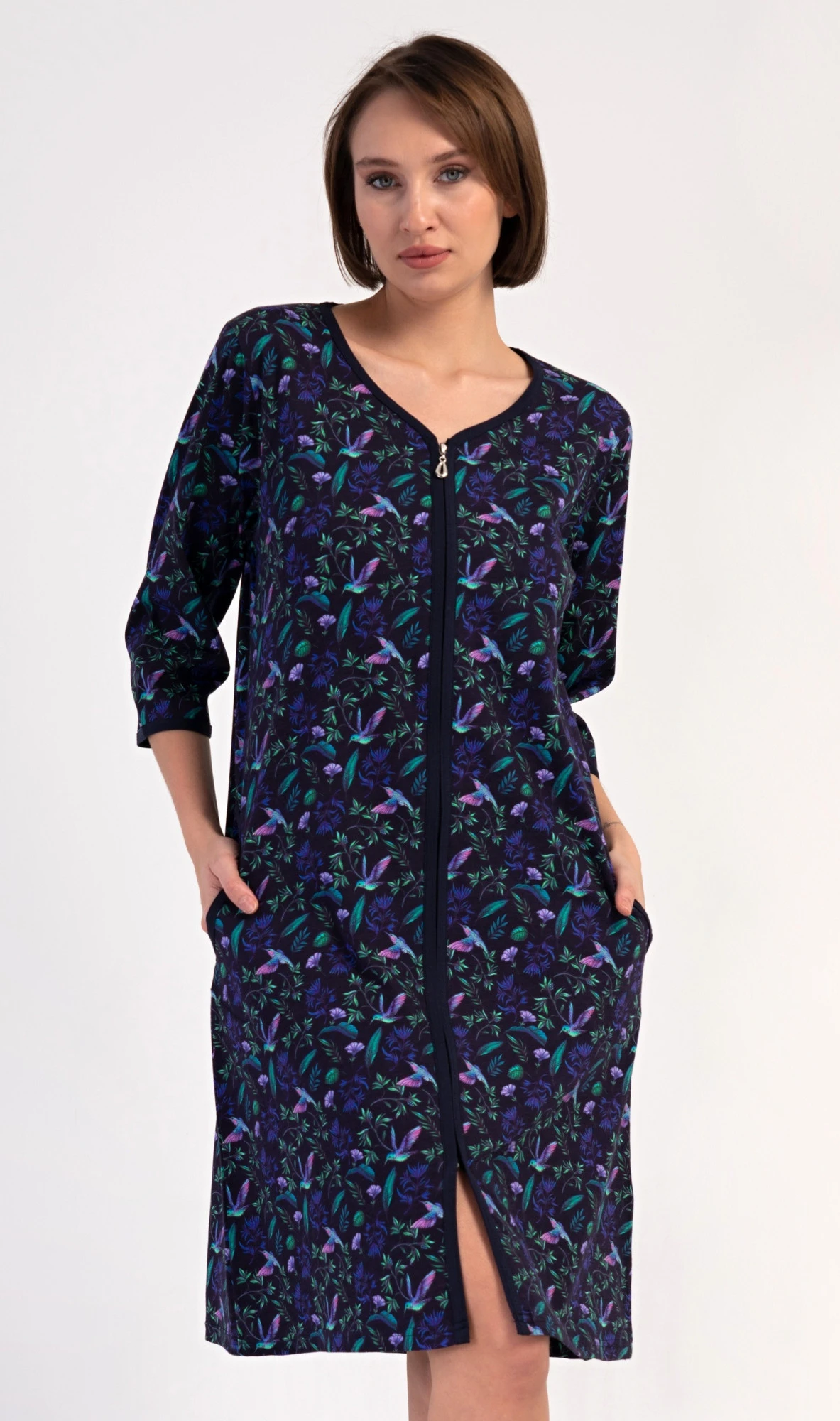 Dámské bavlněné domácí šaty s tříčtvrtečním rukávem Kolibřík. Pohodlné rozepínací šaty v příjemné délce pod kolena využijete téměř při všech volnočasových aktivitách. Mají praktické kapsy a zapínání na zip. Šaty jsou potištěny kolibříky. Použitý bavlněný materiál je příjemný a poddajný na dotek.