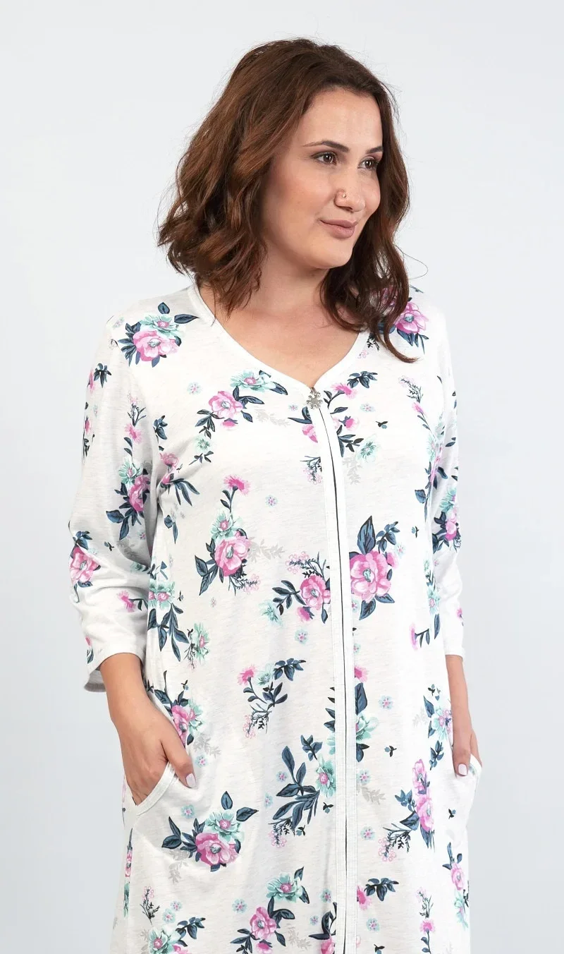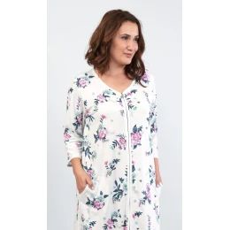 Dámské domácí šaty s tříčtvrtečním rukávem Kristýna. Dámské domácí šaty v příjemné délce ke kolenům jsou celorozepínací, se zipsem. Látka je potištěna výraznými květy na světlém podkladu. Šaty jsou velice pohodlné a využijete je téměř při všech volnočasových aktivitách. Oceníte i praktické kapsy. Použitý materiál je příjemný a poddajný na dotek.