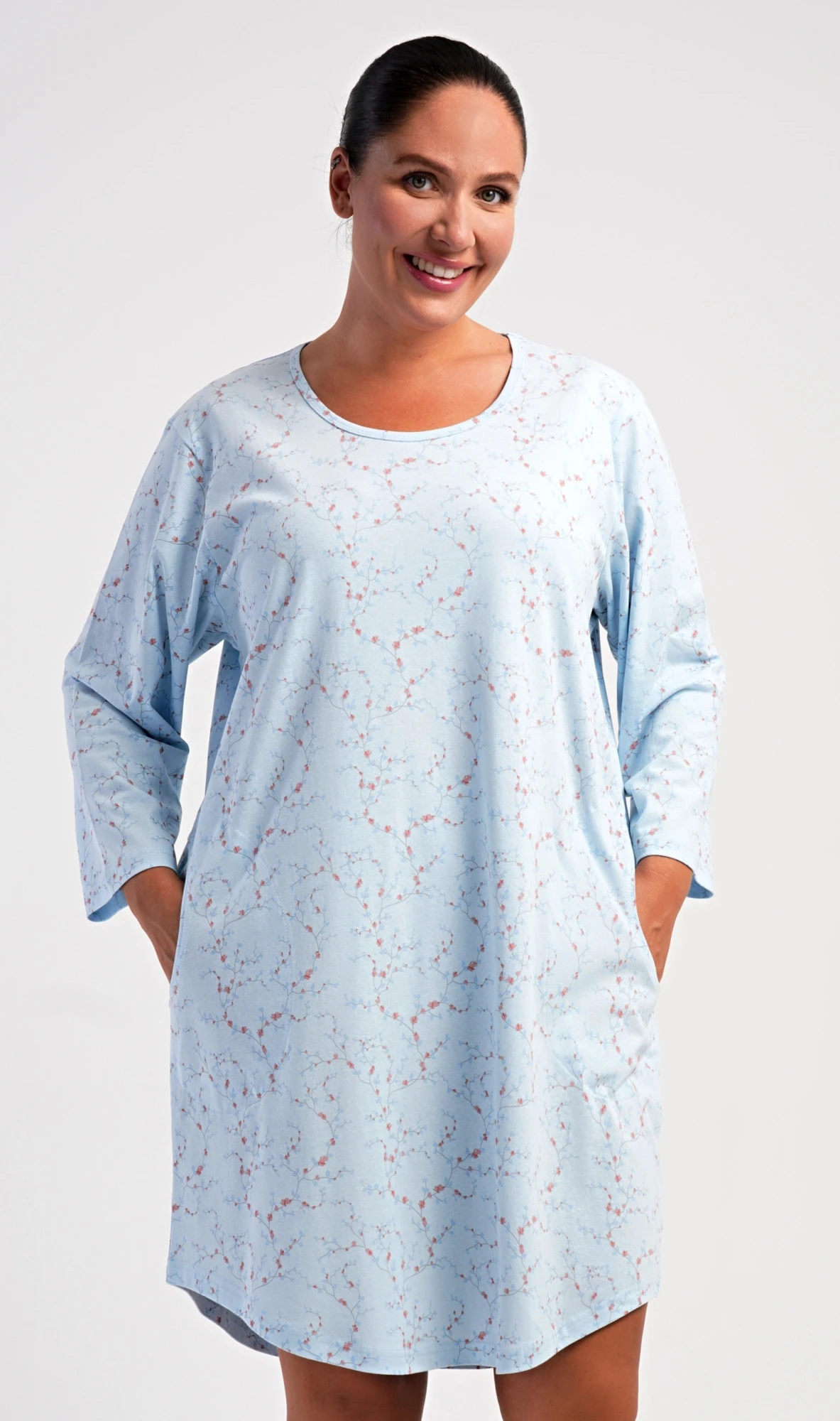 Dámské bavlněné domácí šaty s tříčtvrtečním rukávem Lauren. Domácí bavlněné šaty s kulatým výstřihem a praktickými kapsami jsou potištěny drobnými květy. Použitý bavlněný materiál je příjemný a poddajný na dotek.