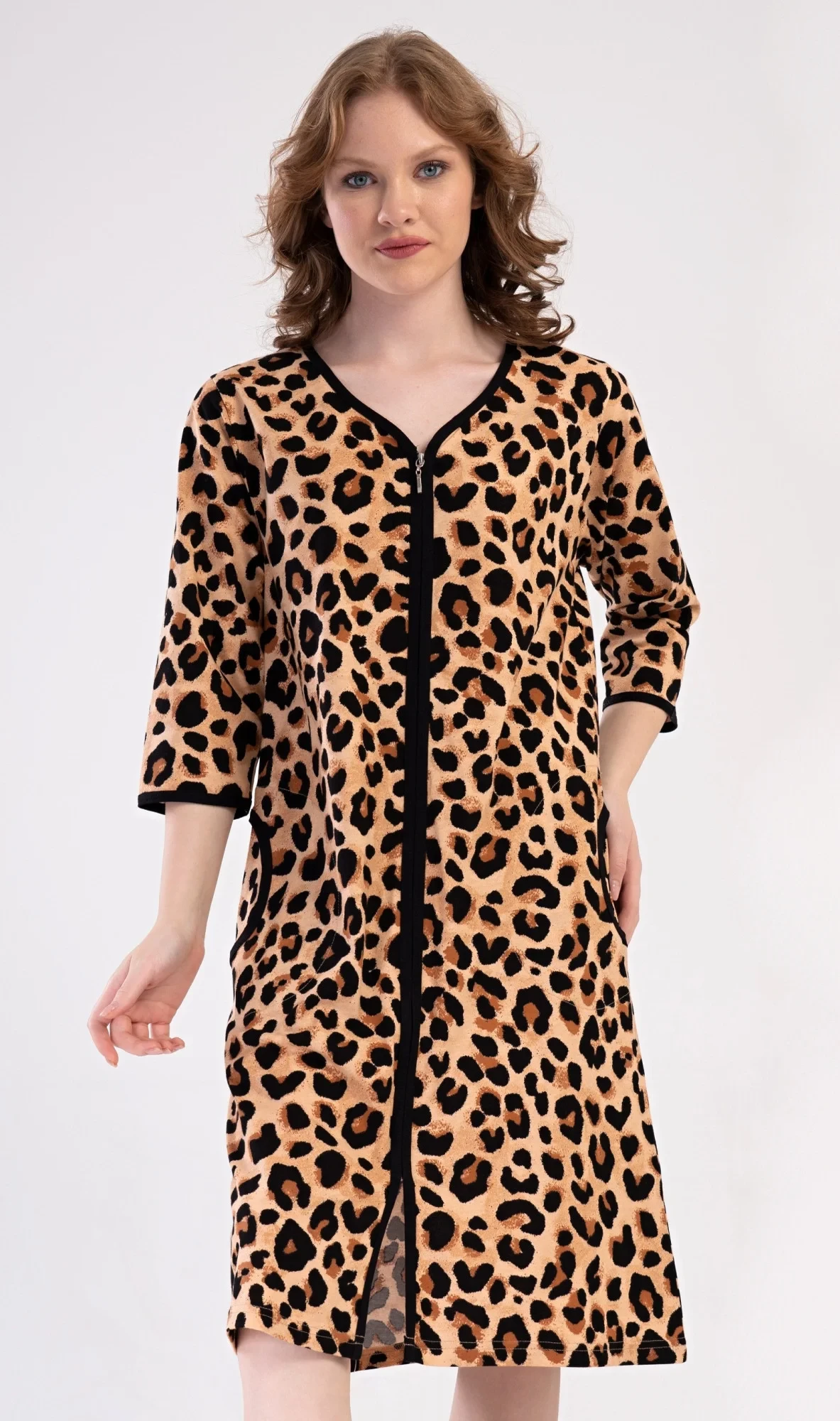 Dámské bavlněné domácí šaty s tříčtvrtečním rukávem Leopard. Pohodlné rozepínací šaty v příjemné délce pod kolena využijete téměř při všech volnočasových aktivitách. Mají praktické kapsy a zapínání na zip. Šaty jsou potištěny leopardím motivem. Použitý bavlněný materiál je příjemný a poddajný na dotek.